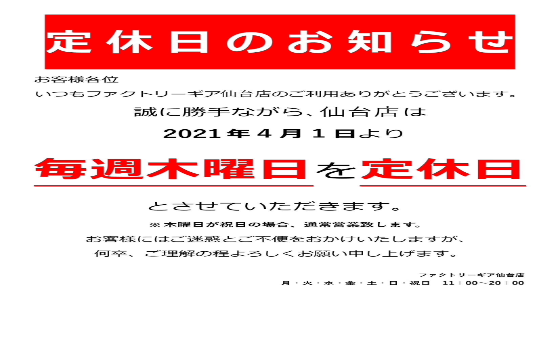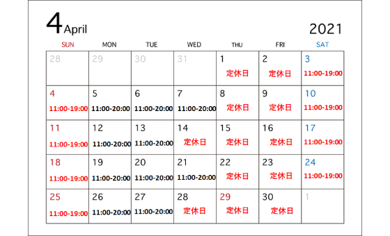 4月より営業時間が少し変更となります。 平日:11時~20時 土日祝日:11時~19時 定休日:木・金曜日、店長不在日は臨時休業となる日がございます。 […]