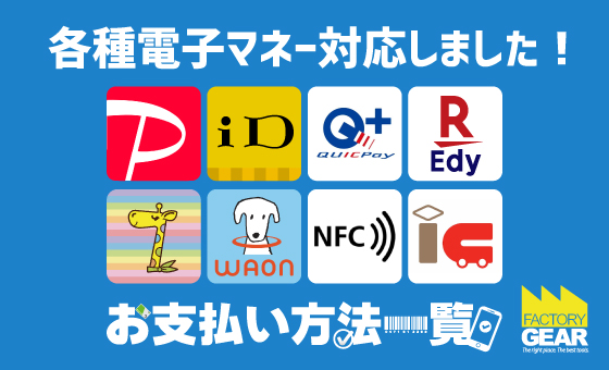 ここ最近ファクトリーギアに来たよ!というお客様はもうお気づきかもしれませんが、お店で使える電子マネーの種類が増えました! ここでは現金以外の店頭での支払い方法についてご紹介します! クレジットカード各種 これは今まで通り […]