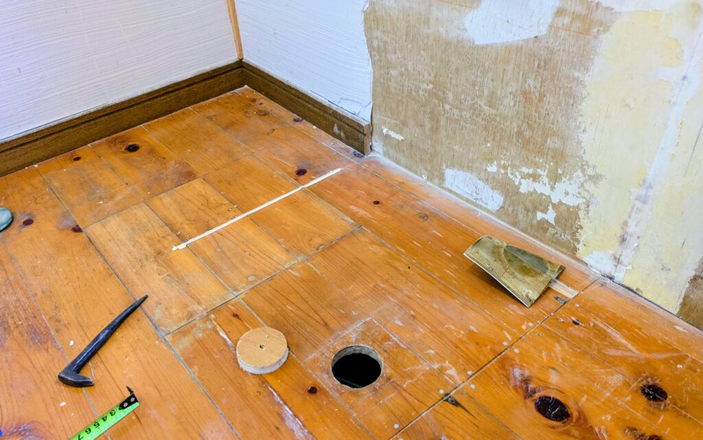 過去に何度か給排水を手直ししてるんだね。アルミの蓋を剥がしてみると配管穴や切り込みだらけ。まずはこれらの補修と床の塗装直しから。