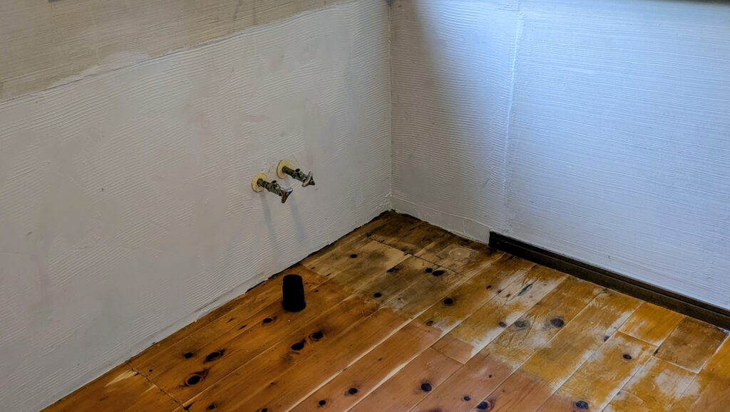 さてまずは古い洗面台を撤去してと。。。ありゃま!床がえらいことになってるよ(・–・;)ゞ