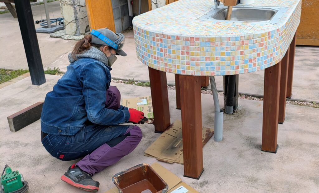 流し台の脚部も潮風に吹きっさらされたのでヤスリがけして塗装し直します。