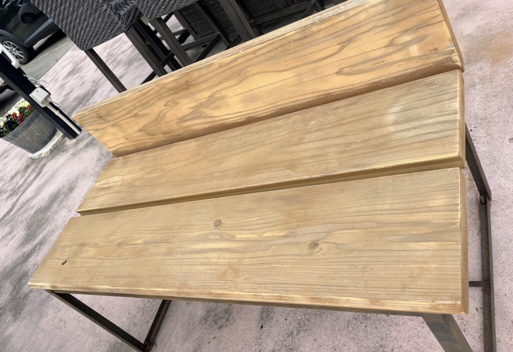 私カミジョウが1番最初に手がけたのがパーゴラエリア、あれから5年、だいぶ劣化も進み汚れた感じ〜主役のスペースだから今年の夏に向けてリニューアルしまーす!