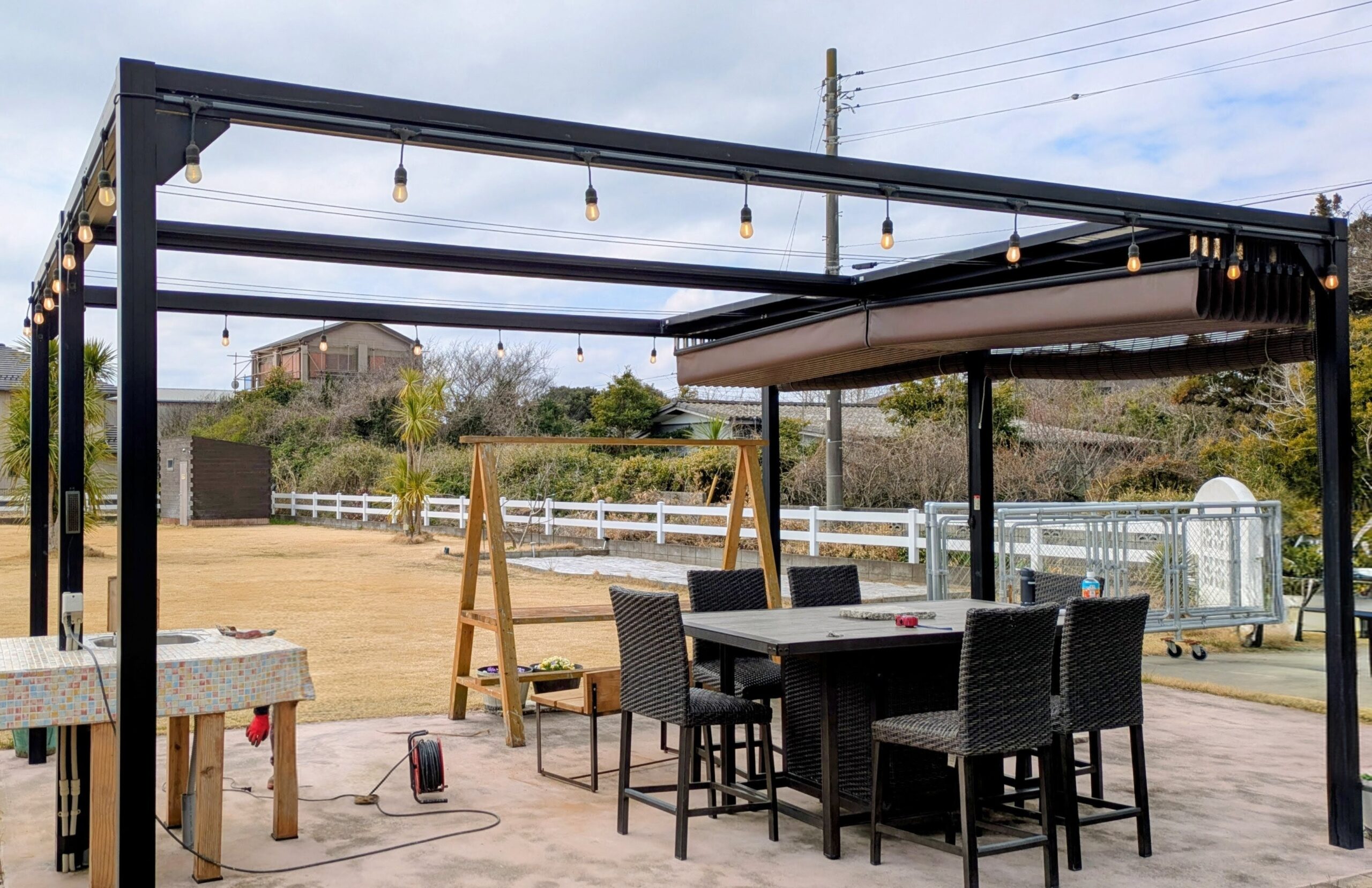屋根が閉じるパーゴラは常にBSBの主役スペース。海風がぬける為どうしても痛みが激しく汚くなっちゃう。これまで細々と修繕はしてきたけど今回はフルにリニューアルします。