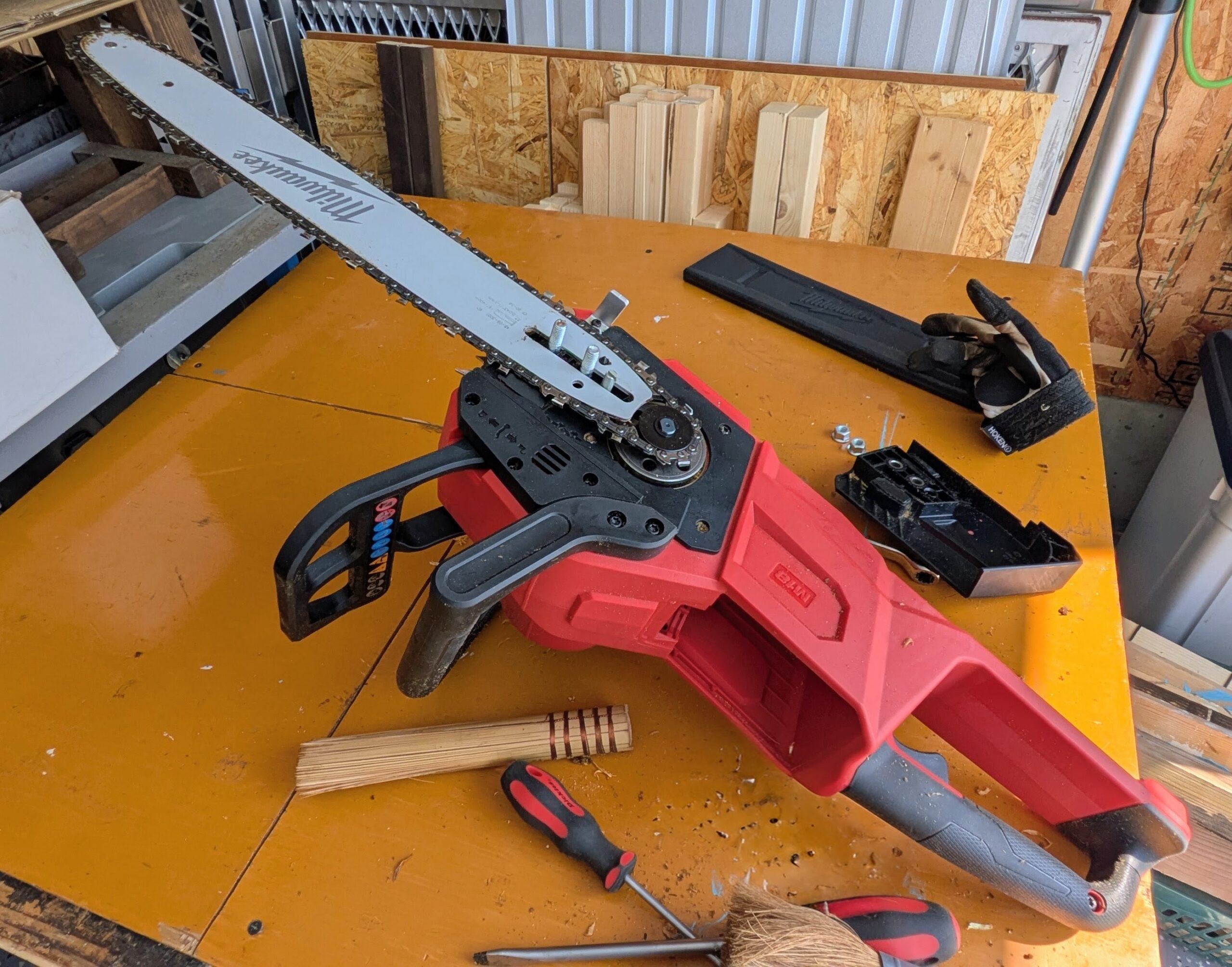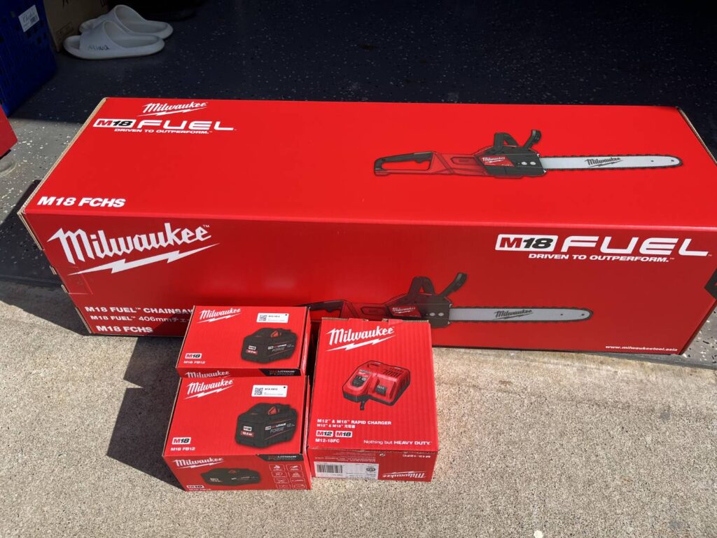前からおねだりしていたチェーンソーがやってきました。真っ赤なボディがとてもまぶしいぜ!