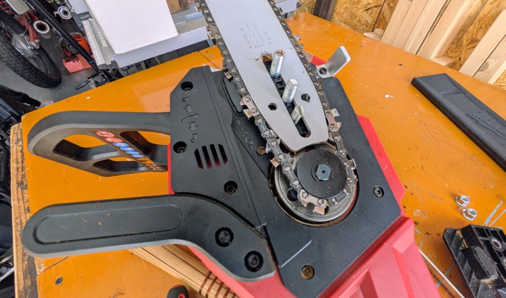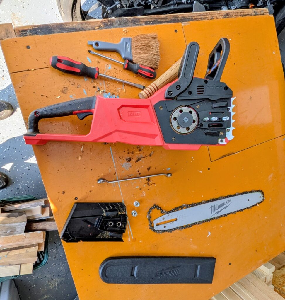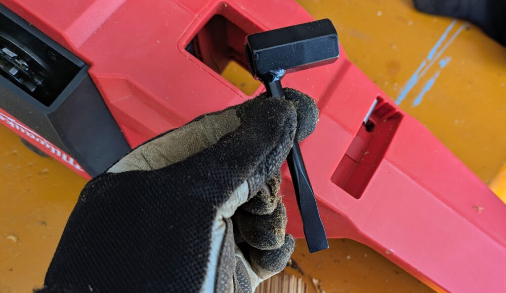 バッテリーを充電している間にチェーンソーオイルを入れてチェーンの張りを確認。ドキドキ