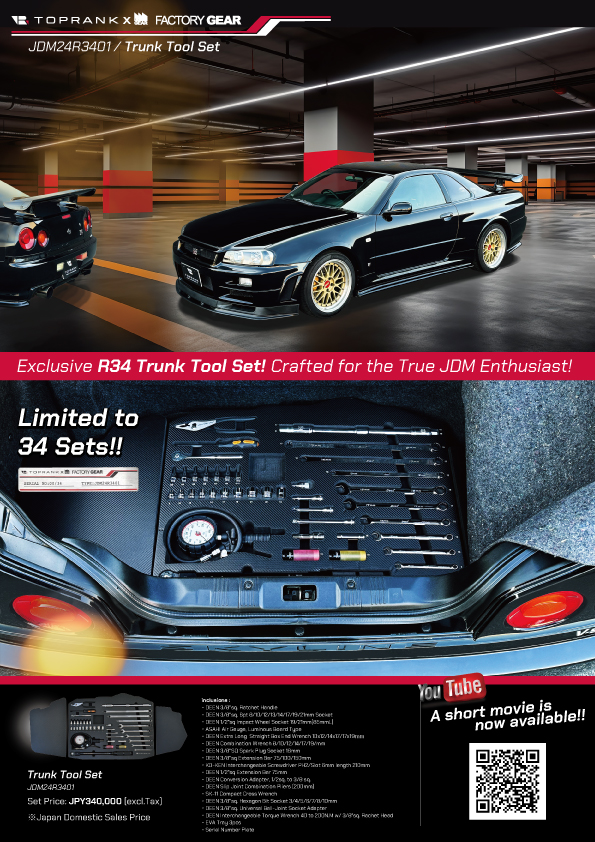 近年は特に「5年ルール」解除により、R34 GT-Rの海外需要が急増しており、そのタイミングで“オリジナルの車載工具セット開発”というプロジェクトが始動しました。