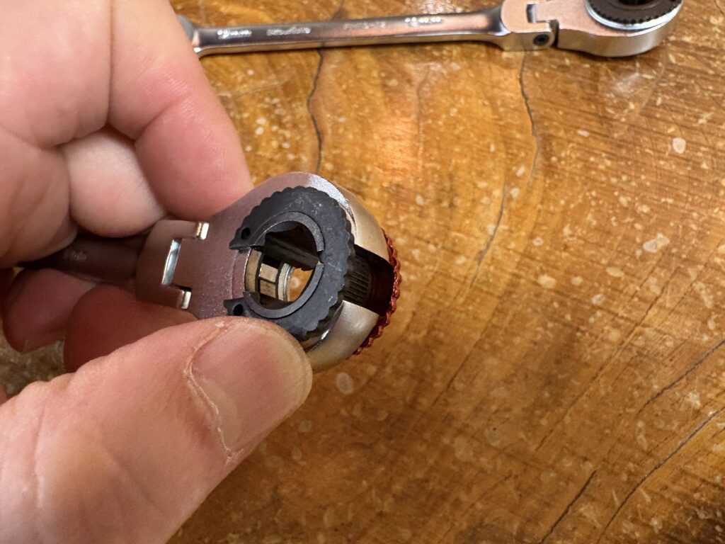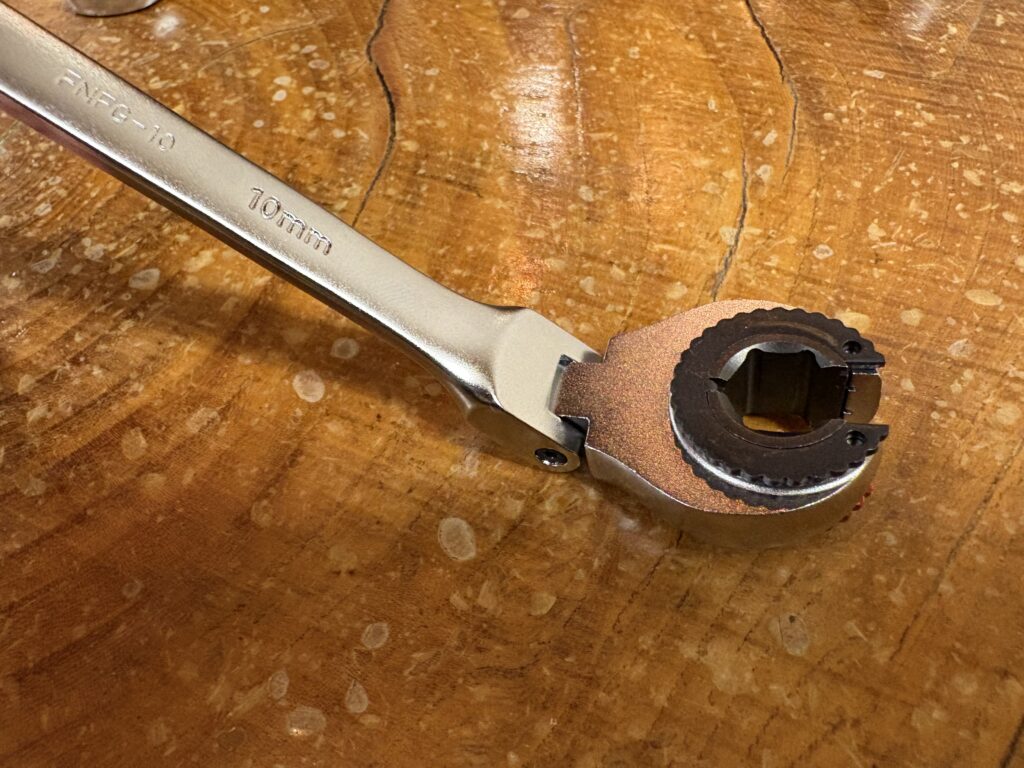 専用レンチじゃないとナメやすいけど、作業姿勢によっては角度が取れずに回しづらい…。