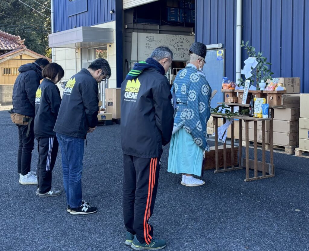 新春セール対象の商品を、出荷前に神主さんをお呼びしてご祈祷しています。