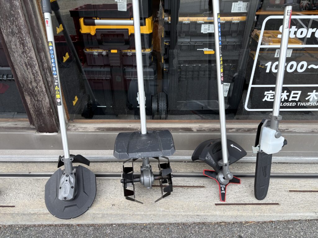 アタッチメントはこの4種類の他にもポンプやヘッジトリマーなど合計12種類。